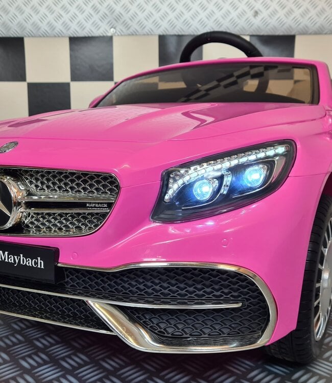 Deze  elektrische kinderauto Mercedes Maybach is uitgerust met voor en achter verlichting. Deze kan voor en achteruit rijden door een schakelpookje op het dashboard te bedienen. Tevens kunnen de deuren open en dicht van deze roze Maybach.