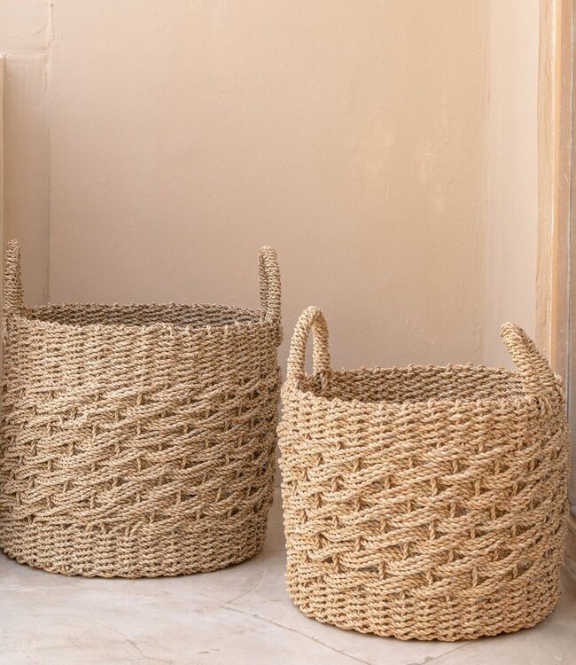 • 38 (M) of 44 (L) cm diameter, 32 (M) of 37 (L) cm hoog • gemaakt van flexibel, duurzaam zeegras • met praktische handgrepen, perfect als wasmand of voor het opbergen van kleine spullen • de verpakking is plasticvrij • 100% handgemaakt en eerlijke handel • gratis verzending en 10% korting op alle bestellingen in onze Orderchamp-winkel boven € 350,-