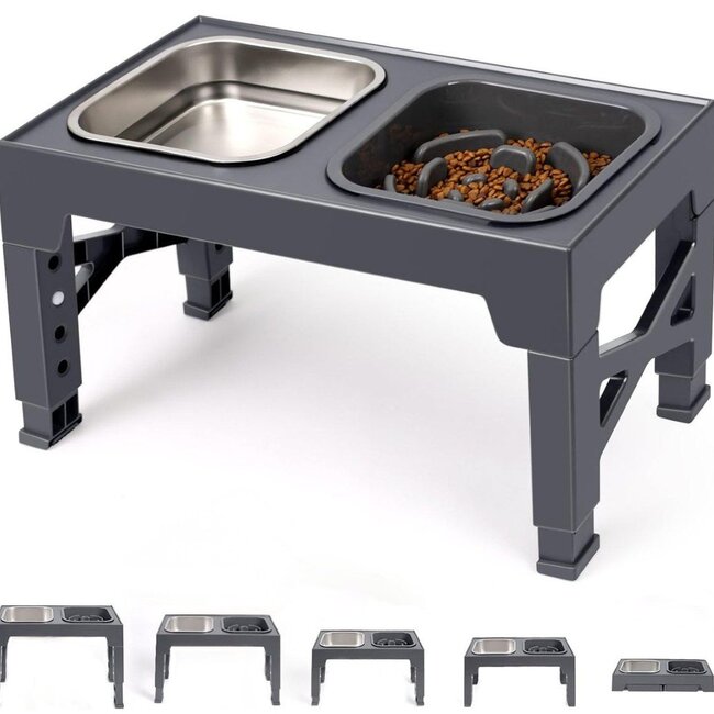 geschikt voor alle honden, van puppy tot grote hond in 5 hoogtes verstelbaar: 7.5, 21.5, 24.5, 27.5 en 31 cm afmeting: 43 x 23.5 cm opklapbaar RVS drinkbak kunststof slowfeeder anti-schrok vo... Lees meer.