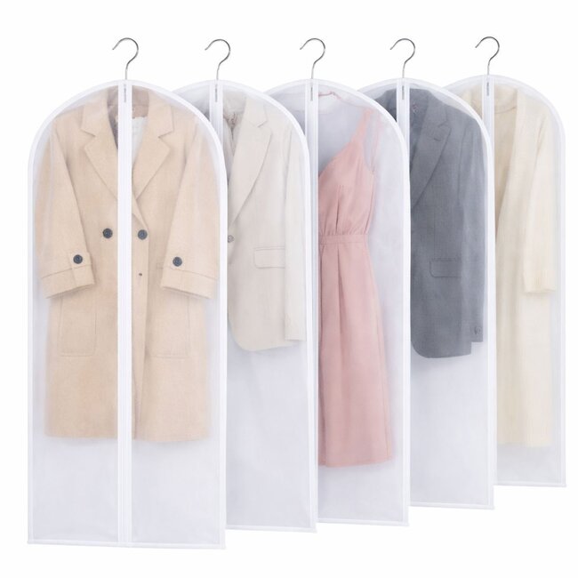 set van 5 kledinghoezen voor hangende kleding groot formaat: 60 x 140 cm semi transparant inkeping voor kledinghanger stofdicht waterafstotend ritssluiting 90 gram per hoes ademend materiaa... Lees meer.