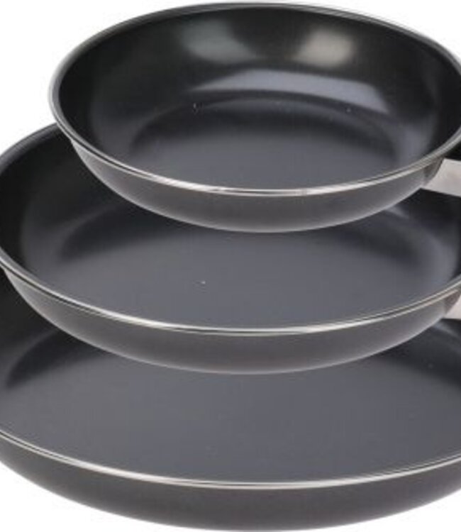ideaal voor de camping diameter: 20, 25 en 30 cm carbonsteel met non-stick coating bakelite handvat gewicht van de set: 930 gram Lees meer.