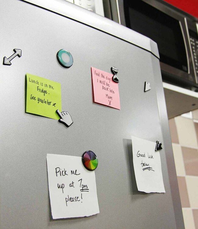 Voor iedereen die zijn muisaanwijzer in de keuken al mist, zijn er nu deze stijlvolle koelkastmagneten in de vorm van verschillende cursorsymbolen. Onder andere de wijzende vinger, de zandloper en de klassieke muisaanwijzer komen terug in deze set van 7 koelkastmagneten. Met deze magneten verander je je ouderwetse koelkast in een digitale hub voor informatie van welke aard dan ook Perfect om kleine berichtjes achter te laten voor je dierbaren of om foto's uit te lichten.