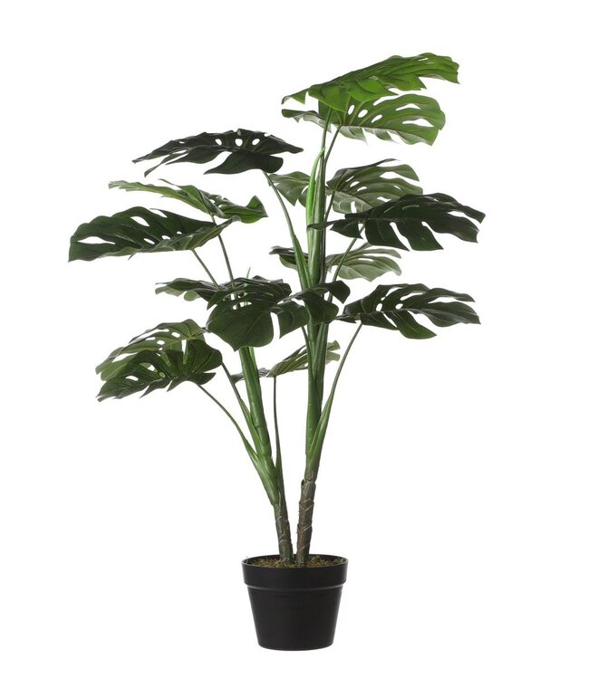 Klaar om zorgeloos te genieten? De kunstplanten van Mica Decorations zijn niet van echt te onderscheiden, maar hebben geen enkel onderhoud nodig. De Monstera wordt ook wel gatenplant genoemd staat bekend om de grote bladeren met gaten. Het blad is uitgevoerd in verschillende maten en groentinten voor een natuurlijk effect en brengt gelijk een botanische sfeer in huis. De plant is stevig verankerd in een zwarte kunststof pot, maar moet voor gebruik wel nog in model worden gebracht. Vuistregel: het blad moet je aankijken! Zet hem na het uitvouwen zo neer, of gebruik de kunststof pot als stevige basis voor een sierlijke overpot. Combineer hem met andere kunstplanten en -bloemen uit de collectie en breng meer groen in huis. De Monstera is ongeveer 1 meter hoog en heeft een diameter van 70 cm. Gewicht: 800g kleuren: Groen