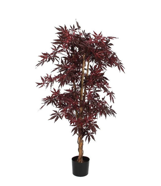 De kunstplanten voor binnen van Mica Decorations zijn niet van echt te onderscheiden, maar hebben geen enkel onderhoud nodig. Met deze rode esdoorn haal je echt iets bijzonders in huis! De kunstplant heeft stervormige bladeren in een warme rode kleur. Door het blad uit te voeren in verschillende maten en rode kleurnuances ontstaat een natuurlijk effect. Zeker in combinatie met de natuurlijk houten stam! De esdoorn is stevig verankerd in een zwarte kunststof pot, maar moet voor gebruik wel nog in model worden gebracht. Hierbij geldt de volgende vuistregel: het blad moet je aankijken. Zet het boompje na het uitvouwen zo neer, of gebruik de kunststof pot als stevige basis voor een sierlijke overpot. Eenmaal uitgebouwen heeft de kunstplant een afmeting van H140 x Ø80 cm. Gewicht: 4800g kleuren: Rood, Rood