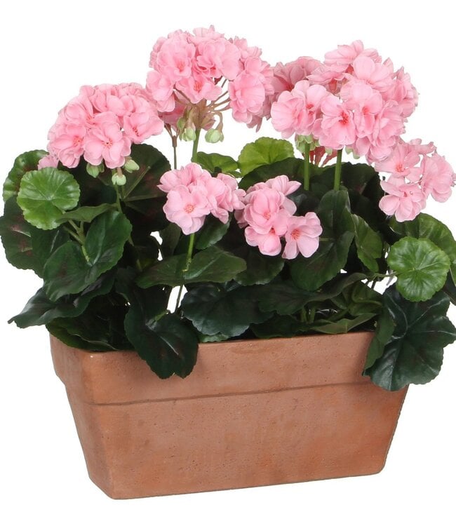 Fleur het interieur op met deze roze Geranium kunstbloemen uit de collectie van Mica Decorations. De bloemen zijn uitgevoerd in verschillende groeistadia: van nog in de knop tot al in bloei, waardoor de kunstplant net echt lijkt. Daarnaast vergt de plant geen enkel onderhoud en geniet je heel het jaar door van bloeiende bloemen in huis. Ideaal! De Geranium is al gemodelleerd en stevig verankerd in een langwerpige bloempot van zandcement. De pot is uitgevoerd in een natuurlijke terra kleur en met van alles te combineren. Waar zet jij hem neer? De afmetingen van de plant inclusief balkonbak zijn L29 x B13 x H40 cm.