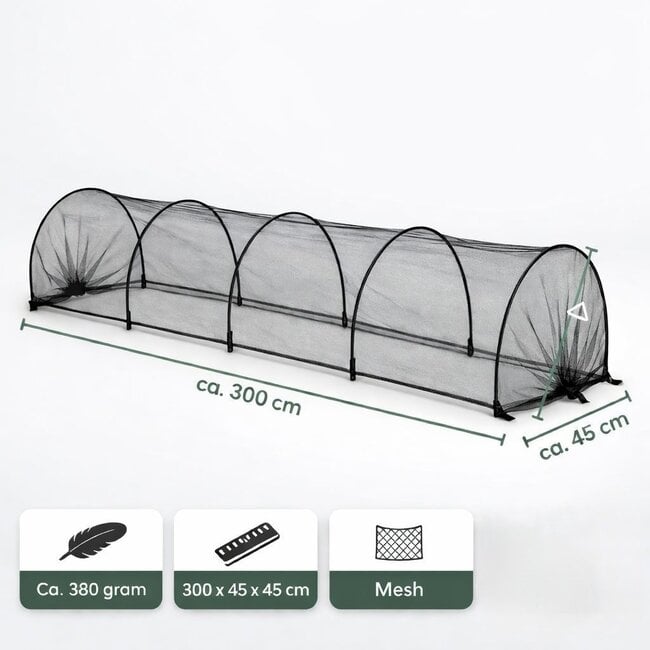 beschermt planten, groente en fruit tegen vogels en insecten de flexibele tunnelbogen kunnen in de grond worden gestoken materiaal: micromesh net en metalen frame afmeting: 300 x 45 x 45 cm kle... Lees meer.