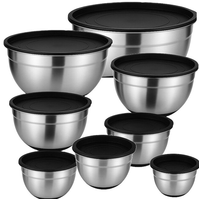 roestvrijstaal, 201 stainless steel afsluitbare kunststof deksels stapelbaar set van 8 beslagkommen: Ø 30 cm, hoogte 13.5 cm, inhoud 7 liter Ø 28 cm, hoogte 12.5 cm, inhoud 5 liter Ø 24 cm, h... Lees meer.