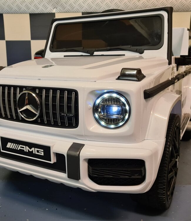 Witte Mercedes G63 12V met 2,4G afstandsbediening. Luxe lederen zetel, rubberen banden en zachte start voor veilige rit. Perfect voor kinderen vanaf 3 jaar (let op: kleine onderdelen). Lees meer.