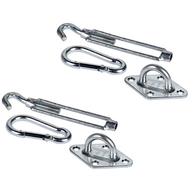 Complete bevestigingsset voor het ophangen en strakzetten van een schaduwdoek of zonnezeil. 2 x karabijnhaken 2 x spanhaken 2 x plaat met oog zware uitvoering Lees meer.