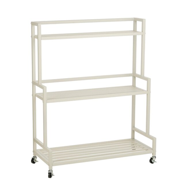 Specificaties Mica Decorations Greenrax Plantenstandaard H100 cm Afmetingen: L80 x B35 x H100 cm Materiaal: IJzer Kleur: Offwhite Gebruik: Buiten Eigenschappen: Waterbestendig, uv-bestendig, met wielen Let op: Niet vorstbestendig Gewicht: 9000g kleuren: Beige