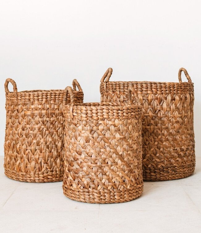 • Warme, natuurlijke esthetiek: het natuurlijke waterhyacintmateriaal creëert een ontspannen, tropisch-minimalistische sfeer • Opvallende stijlupgrade: Raja is met zijn ingewikkelde geweven patroon een echt statement-stuk en voegt een handgemaakte, stijlvolle toets toe aan elke kamer • Veelzijdig en functioneel: houdt uw huis netjes en kan worden gebruikt als wasmand, plantenbak of decoratief element • Handige handgrepen: Dankzij de gemakkelijk vast te pakken handvatten kunt u de mand eenvoudig door het huis dragen, zelfs wanneer deze volledig beladen is • Lichtgewicht en toch stevig: Moeiteloos draagbaar, maar toch sterk genoeg om zware lasten te hanteren dankzij het duurzame materiaal • Stapelbaar ontwerp: De drie formaten kunnen worden genest wanneer ze niet worden gebruikt, waardoor waardevolle ruimte wordt bespaard • Verkrijgbaar in drie maten, 35 (M), 40 (L) of 50 (XL) cm diameter • 100% handgemaakt en eerlijke handel • Bliksemsnelle verzending, de verpakking is plasticvrij