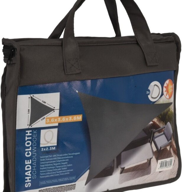 polyester 360 x 360 x 360 170 gram/m2 grijs waterafstotende coating UPF 50+ 3 metalen hoekhaken 3x touw lengte 230 cm opbergtas Lees meer.