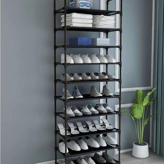 Een 10-laags schoenenrek biedt veel ruimte voor meer dan 20 paar schoenen. Het stevige metalen frame van 13 mm en de waterafstotende non-woven vinyl planken zorgen voor een lange levensduur en stabiliteit. Lees meer.