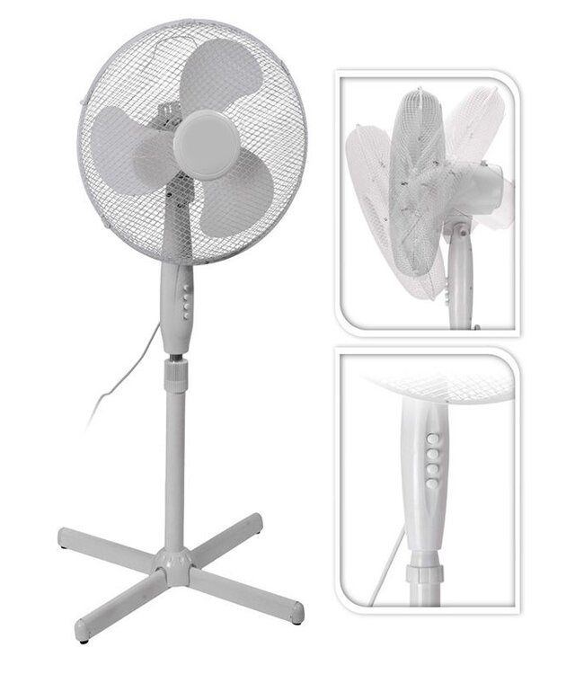 Diameter ventilatorblad: 40 cm In hoogte verstelbaar (max. 125cm). Met 3 snelheden Met draaifunctie (stilstaand of zwenkend) Vermogen: 45W. Snoerlengte: 140cm. Lees meer.