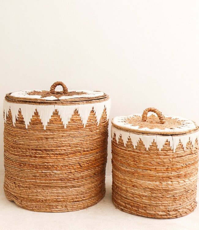 Wasmand met deksel Handgeweven van bananenvezel EMPAT Grote decoratieve mand met witte katoenen macramé (2 maten)