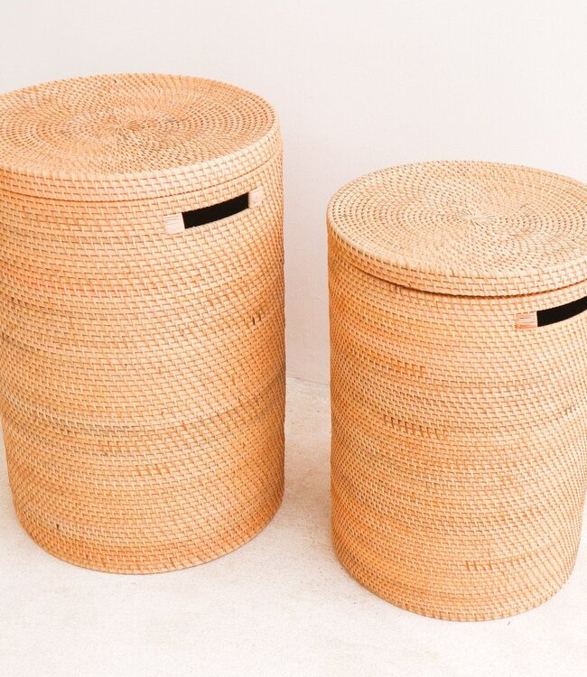 • 35 (m) of 40 (l) cm diameter, 50 (m) of 57 (l) cm lang • Gemaakt van stevige, duurzame rattan • Met praktische deksels perfect als een wasmand • De verpakking is plasticvrij • 100% handgemaakte en eerlijke handel • Gratis verzending en 10% korting voor alle bestellingen in onze Orderchamp -winkel boven € 350
