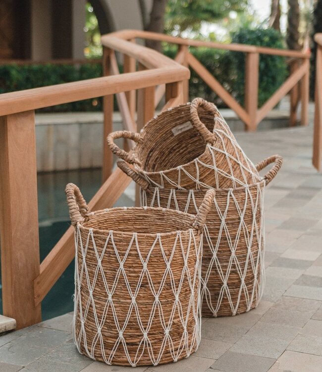 • 30 (S), 35 (M) of 40 (L) cm diameter, 36 (S), 40 (M) of 44 (L) cm hoog • gemaakt van stevige, duurzame bananenvezel met een prachtig katoenen koordpatroon • met praktische handvatten, perfect als wasmand of voor planten • plasticvrije verpakking • 100% handgemaakt en eerlijke handel • gratis verzending en 10% korting op alle bestellingen in onze Orderchamp-winkel boven € 350,-