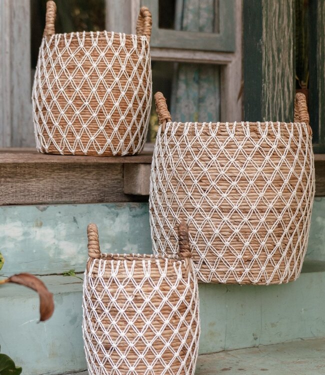 • 23 (S), 27 (M) of 38 (L) cm diameter, 26 (S), 33 (M) of 38 (L) cm hoog • gemaakt van stevige, duurzame bananenvezel met een prachtig katoenen koordpatroon • met praktische handvatten, perfect als wasmand of voor planten • plasticvrije verpakking • 100% handgemaakt en eerlijke handel • gratis verzending en 10% korting op alle bestellingen in onze Orderchamp-winkel boven € 350,-