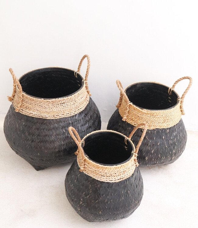 Zwarte plantenmand Decoratieve mand Grote wasmand BENOA (zwart) Handgeweven mand van bamboe en zeegras (3 maten)